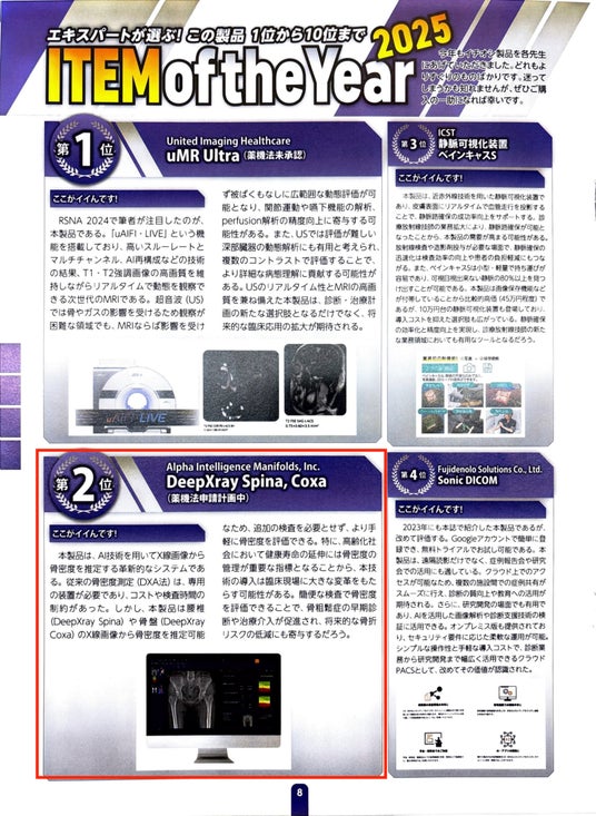 台湾発のAI医療スタートアップ・AIM株式会社(Alpha Intelligence Manifolds, Inc.、以下AIM)は、2025年4月11日~13日にパシフィコ横浜にて開催された国内最大級の医用画像機器展示会「ITEM2025(International Technical Exhibition of Medical Imaging)」関連誌「Rad Fan Plus」の「エキスパートが選ぶITEM of the Year 2025」において、同社のAI骨粗鬆症診断ソリューション「DeepXray(TM) Spina, Coxa」(台湾FDA承認済、米国FDA及び日本薬機法申請計画中)が医療機器部門で第2位に選出された。