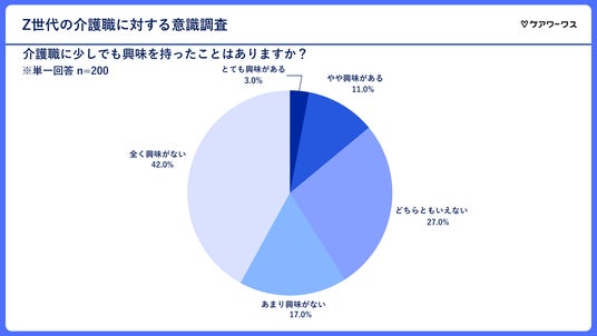 「介護職に少しでも興味を持ったことはありますか?」という質問に対しては、「あまり興味がない」(17.0%)・「全く興味がない」(42.0%)と、消極的な回答が59.0%と過半数を占めました。
