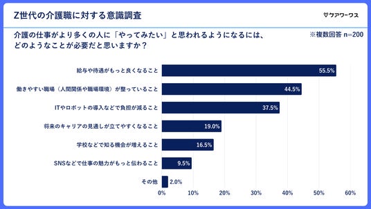 「介護の仕事が、より多くの人に『やってみたい』と思われるようになるには、どのようなことが必要だと思いますか?」という質問に対しては、「給与や待遇がもっと良くなること」と回答した人が55.5%と最も多く、次いで「働きやすい職場(人間関係や職場環境)が整っていること」が44.5%となりました。
