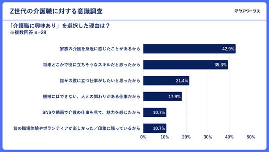 「介護職に興味あり」と回答した理由として最も多かったのは、「家族の介護を身近に感じたことがあるから」で、42.9%と半数近くにのぼりました。次いで多かったのは、「将来どこかで役に立ちそうなスキルだと思ったから」(39.3%)という回答となりました。