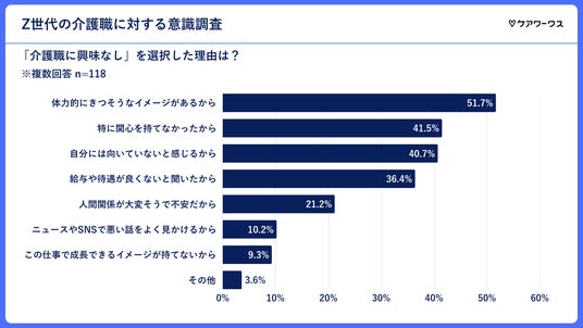 「介護職に興味なし」と回答した理由として最も多かったのは、「体力的にきつそうなイメージがあるから」で、全体の51.7%を占めました。次いで多かったのは「特に関心を持てなかったから」(41.5%)という回答でした。
