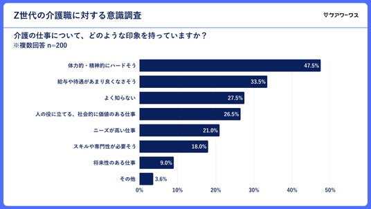 介護の仕事についての印象として最も多かったのは「体力的・精神的にハードそう」(47.5%)で、次いで「給与や待遇があまり良くなさそう」(33.5%)といった回答となりました。