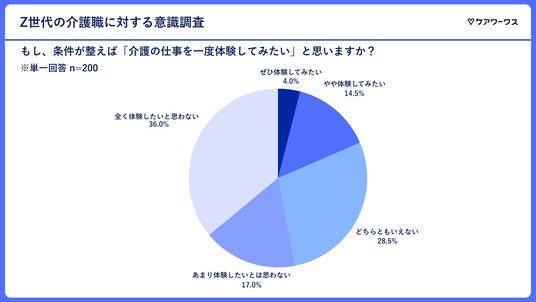 「もし、条件が整えば介護の仕事を一度体験してみたいと思いますか?」という質問に対しては、「あまり体験したくない」(17.0%)、「全く体験したくない」(36.0%)と、半数を超える53.0%の人が体験に消極的である結果でした。