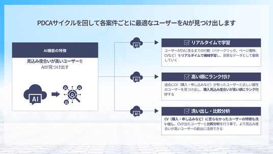 DSP広告の課題であった「成果が出るまでの時間」を短縮。人の目では見つけにくい購入可能性の高いユーザー群をAIが特定・グルーピングし、配信直後から効率的に成果を追求します。
