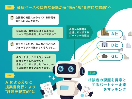 課題を正しく言語化できなければ、最適なソリューションに辿り着くことは困難。AIが課題を可視化し、的確な選択肢を提示する『デジマッチ』が介在することで、ユーザーは安心して次の一歩を踏み出せます。そして、その一歩を受け止めるのがパートナー企業の皆さまです。