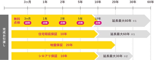 ※1・・・定期的な点検と有償メンテナンス工事を継続していただくことで、10年ごとの延長保証ができ最長30年間の保証をいたします。(長期優良住宅を取得した住宅の場合は最長60年間の保証をします)※2・・・5年ごとの更新手続きで最長30年の保証が利用できます。更新には住戸の点検と更新手数料が必要です。