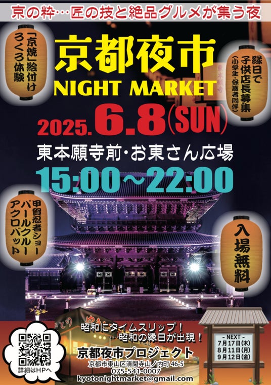 合同会社京都夜市プロジェクト(代表:宮本洋志)は、2025年6月8日(日)に第一回『京都夜市(Kyoto Night Market)』を、東本願寺前の「お東さん広場」で開催いたします。
