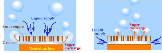 (a) Mode-G (b) Mode-L 図2 呼吸モード(左:グルーブから蒸気排出しロータス銅から液供給、右はその逆)(CC BY 4.0:https://doi.org/10.1016/j.applthermaleng.2025.126776)