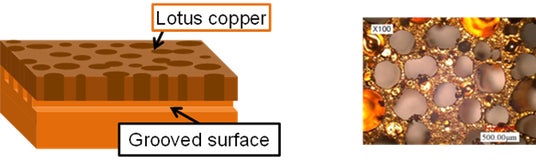 図1 グルーブ施工面に接合されたロータス銅(左)とロータス銅の表面写真(CC BY 4.0:https://doi.org/10.1016/j.applthermaleng.2025.126776)