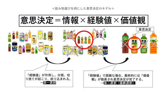 意思決定のフレームワークにより選択肢が絞り込まれるモデル(飲み物選びの例)