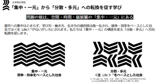 「分散・多元」への転換の重要性が指摘されて年月が経ちますが、依然として都市への集中はとまらず、学び方・働き方、生き方の選択肢は画一的です。競争・効率をベースとした社会では<生 Life>が重視されません。私たちは「分散・多元」の生き方を実践すべく、新たな教育研究の場をつくります。