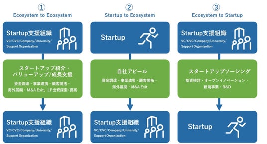 グローバルのスタートアップ支援機関(VC/CVC/大学/政府機関等)間で支援・投資先のスタートアップを紹介することでバリューアップ/成長支援、資金調達・事業連携・顧客開拓・海外展開・M&A Exit等を実現