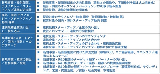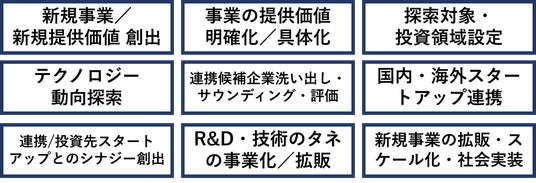 企業の未来の柱となる事業創出に向けて、新価値提供の戦略、国内・海外のスタートアップ連携やシナジー創出、既存で生まれている新規事業の萌芽やR&D技術テーマの拡販・スケール・社会実装などを伴走
