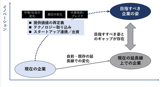 現在企業としては1.市場・社会の変化、2.競合の変化、3.デジタル化等代替技術や新規プレイヤーの存在により、変化が求められている状況です。そうした中で自前・既存の延長線上での変化に限界があり(1)提供価値の再定義、(2)テクノロジー取り込み、(3)スタートアップ連携/出資 等が必須となっています。