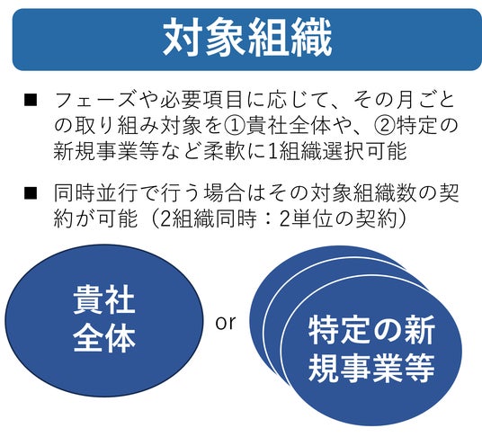 1.フェーズや必要項目に応じて、その月ごとの取り組み対象を1.貴社全体や、2.特定の新規事業等など柔軟に1組織選択可能