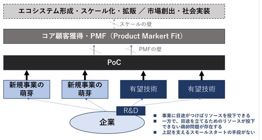 加えて、多くの企業においてR&Dを通じた技術のタネや、事業が生まれつつあるものの、十分にPoCの先の、コア顧客獲得やエコシステム形成/スケール化等など社会実装・市場創出、拡販を行い切れていない状況です。新規事業においては事業拡大の目途が立った上ではリソース投下を意思決定できますが、その目途を立てるための初期リソースの投入ができないという「鶏卵問題」が論点となります。