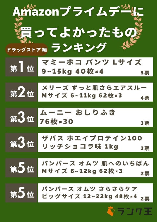 「ドラッグストア」カテゴリでは、子ども用紙おむつや子ども用おしりふきなどの「ベビー用品」が人気を集め、合計22票と上位に集中。