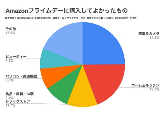 過去のAmazon大型セールで購入した商品のうち、「最も買ってよかった」と感じたアイテムを尋ねたところ、特に人気が高かったカテゴリは「家電&カメラ」(24.8%)や「ホーム&キッチン」(19.5%)でした。
