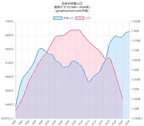 【引用元:グラフで見る日本の労働人口の推移 https://graphtochart.com/population/japan-labor.php 】