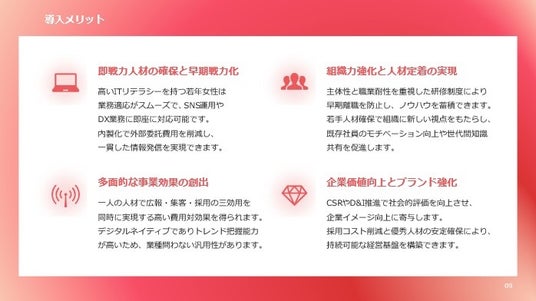 「学歴じゃ無い。私だけのお仕事コレクション」をキャッチコピーに掲げ、これまで学歴によって選択肢が狭まっていた中卒女性を中心とした多くの方の就労機会を広げるとともに、企業の多様な人材ニーズに応え、持続可能な社会づくりに貢献してまいります。