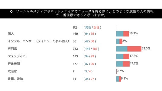 ネットメディアやソーシャルメディアの引用元である情報源にフォーカスした信頼度調査(どの情報源が一番信頼できるか)については、専門家33%、行政機関 18%、マスメディア 17%、個人 17%、インフルーエンサー8%、書籍・雑誌 6%、政治家 0.7%との結果となった。