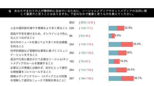 「あなたやまわりの人が精神的に自由でいるために、ソーシャルメディアやネットメディアの活用に関して重要だと思うことはありますか。下記のなかで重要と思うものを教えてください。」との質問に対する回答結果