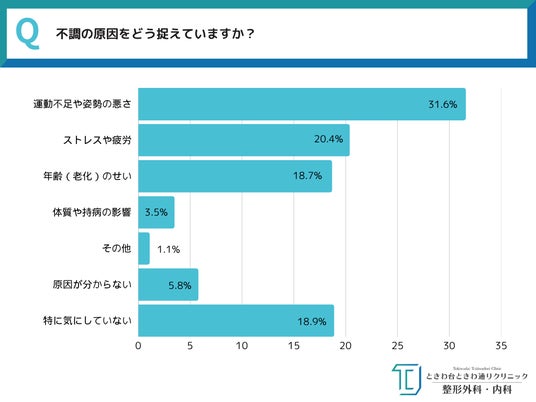 トップ3 1.運動不足や姿勢の悪さ:31.6% 2.ストレスや疲労:20.4% 3.年齢(老化)のせい:18.7%
