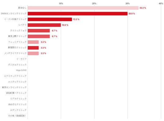 利用したことがあるクリニックについて、「DMMオンラインクリニック」が3割を占める結果となった。