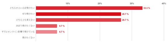 オンライン診療でED治療を受けたいと思うかについて、「どちらかといえば受けたい」と回答した人が最も多く33.3%となり、「ぜひ受けたい」と回答した人も26.7%と多かった。