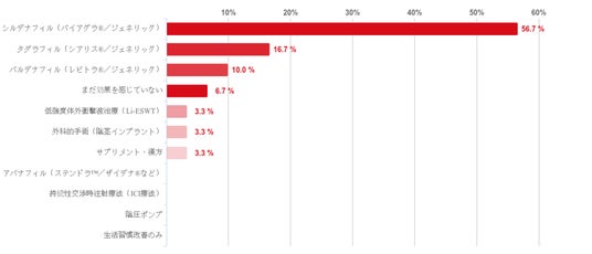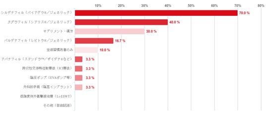 これまでに試したED治療法について、「シルデナフィル」が70.0%と最も多く、「タダラフィル」(40.0%)「サプリメント・漢方」(30.0%)と続いた。