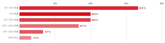 ED治療にかかった総費用は、「1万~3万円未満」と回答した人が33.3%で最も多く、「1万未満」「3万~5万円未満」が共に20.0%と並んだ。