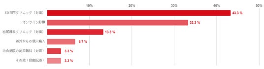 ED治療を受診した医療機関・方法について最も多かった回答は「ED専門クリニック(対面)」(43.3%)だった。