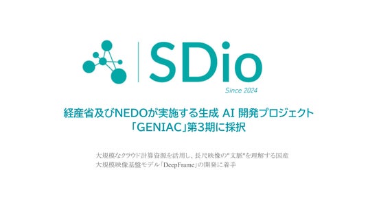 SDio株式会社(本社:東京都中野区、代表者:カイ アバ )は、経済産業省と国立研究開発法人新エネルギー・産業技術総合開発機構(NEDO)が実施する、国内における生成AIの開発力強化を目的としたプロジェクト「GENIAC(Generative AI Accelerator Challenge)」の第三期に採択されたことをお知らせいたします。本事業を通じて、数時間以上の長尺映像を「点」ではなく「ストーリー」として深く理解する、大規模映像基盤モデル「DeepFrame LVM」の開発を推進していきます。