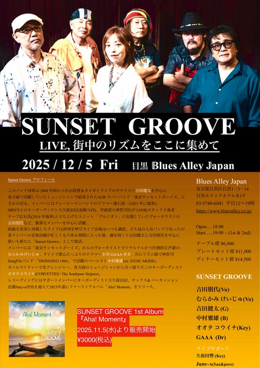 2000年代に一世を風靡したAORカバーバンド「東京サンセットボーイズ」の中心人物でもあった吉田健太、吉田朋代の邂逅は、時を超えた音楽の再起動だった。そこに集まったのは、ドラマーGAAA、ベーシスト中村雅雄、キーボーディスト・アレンジャーのオオタコウイチ、ソウルフルなヴォーカリストむらかみけいじゅ、そしてサポートに大久保治信、Juny-a。いずれも第一線で活躍する百戦錬磨の実力者たち。こうして誕生したのが、SUNSET GROOVE。