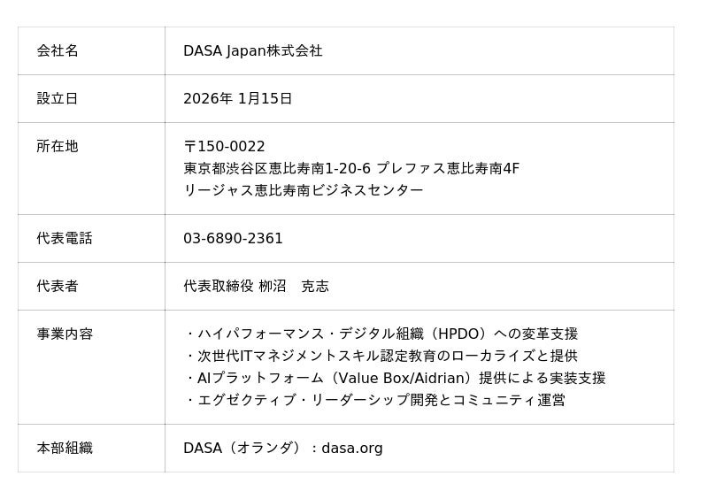 オランダ発のグローバル団体DASA(DevOps Agile Skills Association)の日本法人として、DASA Japan株式会社(本社:東京都渋谷区、代表取締役:柳沼 克志)が2026年1月に設立されたことを発表しました。