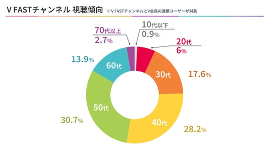 実際に、6月2日のテレビ版リリース後の1ヶ月間におけるユーザーの視聴データ(V FASTチャンネルとV会員の連携ユーザーが対象)を分析すると、30代~50代を中心とした年齢層に支持されており、性別構成は全体では男性が多いものの、チャンネルによっては女性が半分以上を占めるなど、V FASTチャンネルの幅広いジャンルがさまざまな視聴者のニーズを満たしていることが分かりました 。なお、平均視聴時間は約4時間で、視聴のピーク時間帯は夕方17時~19時および深夜23時~25時台に集中しており、既存のSVOD(Subscription Video On Demand=定額制動画配信)サービスがピークとなる19時~23時を避けた時間帯にて視聴されている点も大きな特徴となります。このことから、視聴者が「V FASTチャンネル」を通じて、新たな視聴スタイル「#ゆる見」を楽しまれている様子がうかがえます。