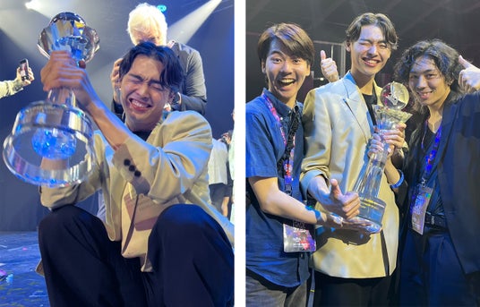 グランプリのトロフィーを手にするIbuki(写真左)とチームメンバーである演出担当のせとな、マネジメント担当のHISAとの集合写真(写真右)