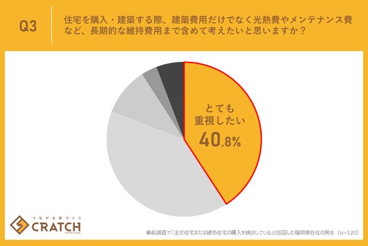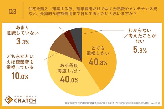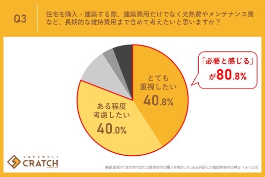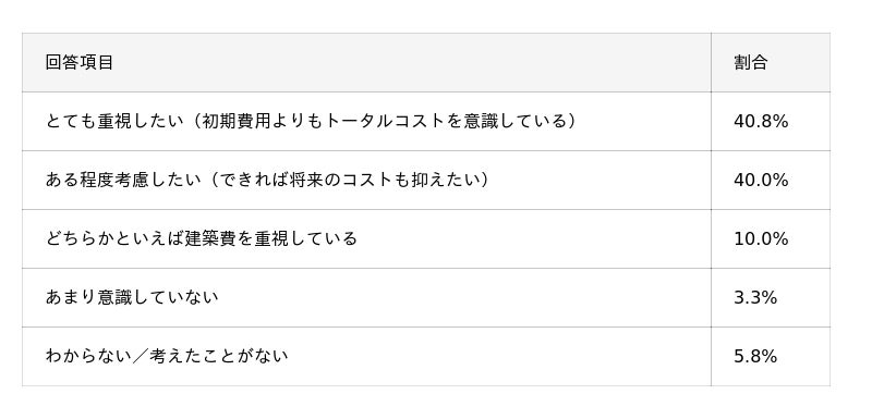 今回の調査で「住宅を購入・建築する際、建築費用だけでなく光熱費やメンテナンス費など、長期的な維持費用まで含めて考えたいと思いますか?」と質問したところ、「とても重視したい」が40.8%、「ある程度考慮したい」が40.0%となり、合計で80.8%もの人々が、目先の建築費だけで判断するのではなく、将来発生しうる費用を視野に入れた家選びを望んでいることが判明しました。
