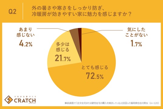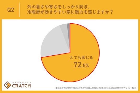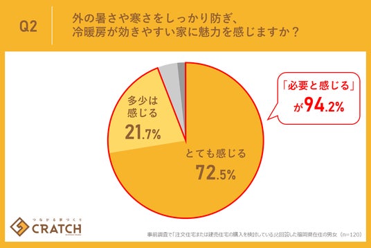 今回の調査で「外の暑さや寒さをしっかり防ぎ、冷暖房が効きやすい家に魅力を感じますか?」という質問に対し、「とても感じる」が72.5%、「多少は感じる」が21.7%となり、合計94.2%という圧倒的多数が、住宅の断熱・気密性能を重視していることが判明しました。
