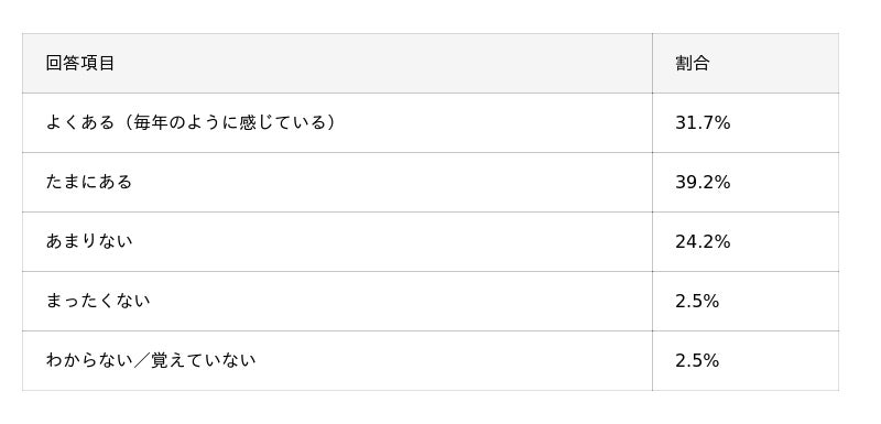 今回の調査で「現在の住まいで冷暖房の効きが悪いと感じた経験はありますか?」と質問したところ、「よくある(毎年のように感じている)」が31.7%、「たまにある」が39.2%となり、合計で70.9%もの人が、程度の差こそあれ冷暖房の効きに不満を感じていることが明らかになりました。