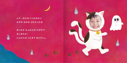 顔写真・お名前が入った世界にひとつだけの特別な絵本はプレゼントにも。「おばけのくに」に迷い込んだ主人公となるお子様が、様々なおばけに変装しながら「にんげんのくに」を目指す、夏にぴったりの物語