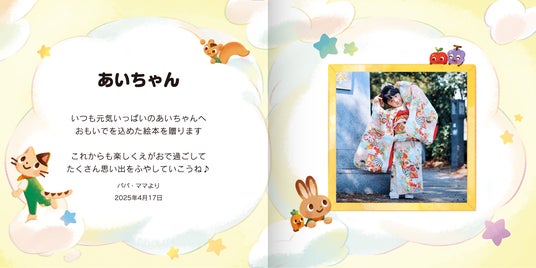 絵本の冒頭には、お写真とメッセージを入れられるページもあります。