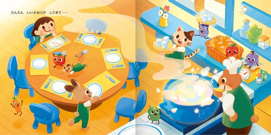 【おもいでレストラン】ある日、ねこちゃんを助けた主人公は、感謝のしるしに「おもいでレストラン」に招待されます。そこには楽しい気持ちが料理の材料になる魔法のおなべがあって……!? お子様と一緒に思い出を振り返りながら楽しめる一冊です。