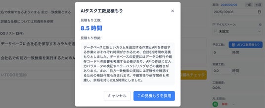 - 工数の自動見積もり: 過去の類似タスクや現在の要件から、AIが客観的な工数を算出。属人的な見積もりによる計画の破綻を防ぎます。