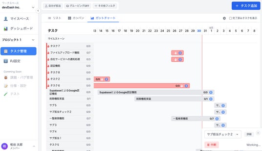 「devDash」は、マネジメント初心者でも直感的に使え、導入したその日から管理業務の大部分をAIに任せられるSaaSプロダクトです。まるで優秀なプロジェクトマネージャーが常にチームに寄り添うように、AIが自律的にプロジェクトを成功へと導きます。