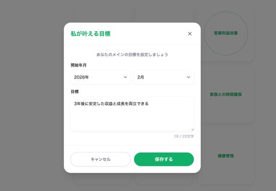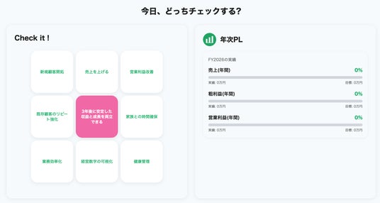 「自己実現(やりたいこと)」と「業績(きちんと稼ぐこと)」を同時に追えるよう、マンダラチャートを用いた目標設定と日々のPL管理を1つのアプリに統合。言葉やイメージを大切にしながら、抵抗感なく数字に向き合うことができます。