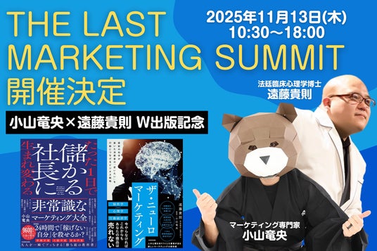 株式会社Trynnox(本社:東京都新宿区、代表取締役:藤村奎介)は、マーケティングコンサルタントであり、登録者10万人越えYouTubeチャンネル「マーケティング侍の非常識なビジネス学」でも知られる小山竜央の約3年ぶりとなる主催リアルイベント『The Last Marketing Summit』を2025年11月13日(木)に開催します。本イベントは、KADOKAWAより2025年11月12日(水)に販売される小山竜央の新著「たった1日で儲かる社長に生まれ変わる 非常識なマーケティング大全」と、『タカ博士』こと法廷臨床心理学博士の遠藤貴則の新著『ザ・ニューロマーケティング 最新の科学が暴いた消費者の「買いたい」を行動につなげるビジネス戦略』のW出版を記念して実施。「世の中で見逃されがちな隠れたチャンスを掴む」をテーマに、2026年以降のマーケティングトレンドを読み解き、次に訪れる新たなサイクルにいち早く乗るためのマーケティングやビジネス戦略を多角的に提唱します。