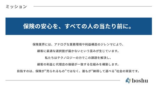 boshu株式会社は、「保険の安心を、すべての人の当たり前に。」というミッションを掲げています。単なる保険代理店支援ではなく、AI技術を通じて保険募集プロセス全体を変革し、消費者一人ひとりが「納得して選べる」透明性の高い保険選びを実現することを目指します。InsureTechスタートアップとして、業界特有の深い課題にテクノロジーで切り込み、人とAIが協働する新たな保険業界の未来を創造します。