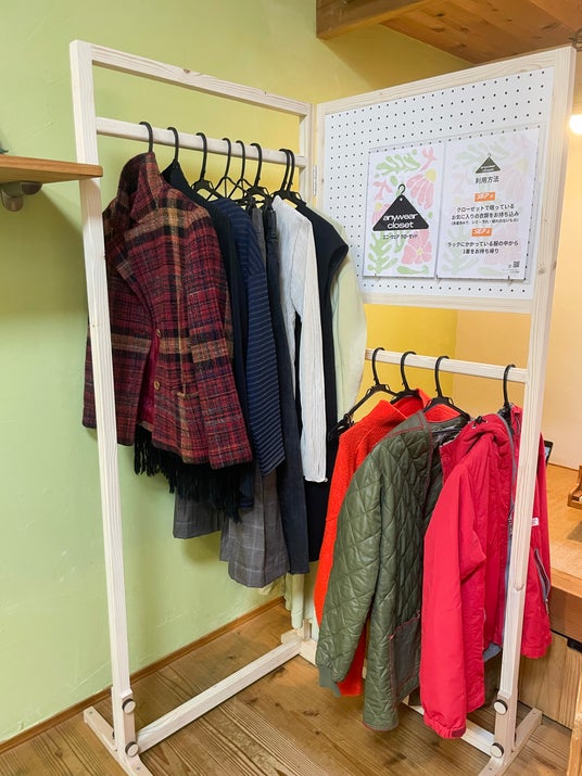 「anywear closet(エニーウェア・クローゼット)」は、誰かに着てもらいたい洋服を1点持ち込むことで、そこに並ぶ洋服の中から1点を無料で持ち帰ることができる交換型のクローゼットです。