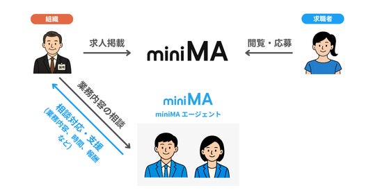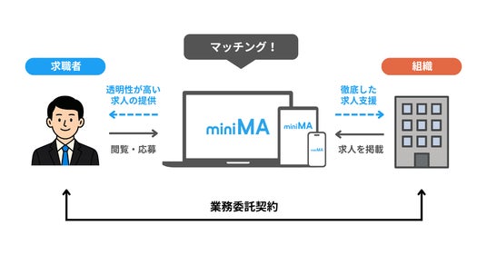 miniMAは、求職者・組織(企業、地方自治体、NPOなど)が、それぞれにとって透明で健全な関係を築ける仕組みを提供します。